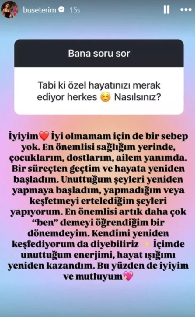 'Özel hayatınızı herkes merak ediyor' diye sorulduBoşanmanın ardından sosyal medya üzerinden yaptığı paylaşımlarla dikkat çeken buse terim son olarak sosyal medyada takipçilerinden gelen soruları yanıtladı. Bir kişi Terim'e 'Özel hayatınızı herkes merak ediyor' diye sordu."İyi olmamam için de bir sebep yok"Ünlü isim bu soruyu yanıtsız bırakmadı ve 'İyiyim. İyi olmamam için de bir sebep yok. En önemlisi sağlığım yerinde, çocuklarım dostlarım, ailem yanımda. Bir süreçten geçtim ve hayata yeniden başladım.