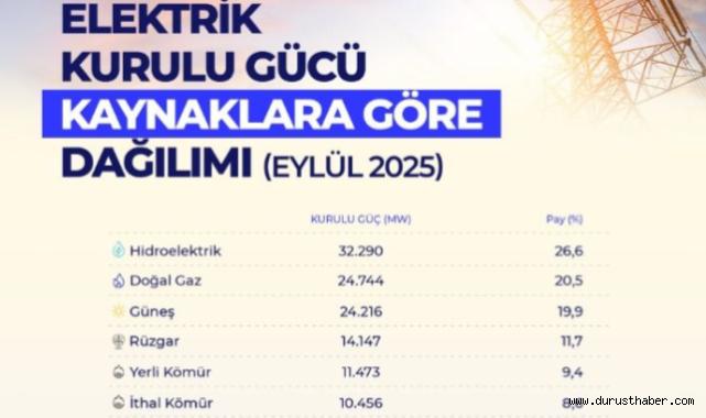 Enerji ve Tabii Kaynaklar Bakanlığı, Türkiye’nin elektrik enerjisi kurulu gücünün Eylül 2025 itibarıyla 121 bin megavatı aştığını duyurdu. Bakanlık açıklamasında, “Kurulu güçte yenilenebilir enerji kaynaklarının oranı %61’i geçerken, yerli kaynakların oranı %71 olarak gerçekleşti. Adım adım enerjisi yüksek bir Türkiye inşa etmeye devam ediyoruz” ifadelerine yer verildi.