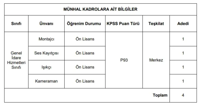 Diyanet İşleri Başkanlığımız Merkez Teşkilatında münhal bulunan ve aşağıdaki tabloda bilgileri yer alan montajcı, ses kayıtçısı, ışıkçı ve kameraman kadrolarına 2024 yılı Kamu Personel Seçme Sınavı puan sırası esas alınarak aşağıdaki tabloda belirtilen boş kadroların üç katı kadar aday arasından Başkanlıkça yapılacak sözlü sınav sonucuna göre alım yapılacaktır.