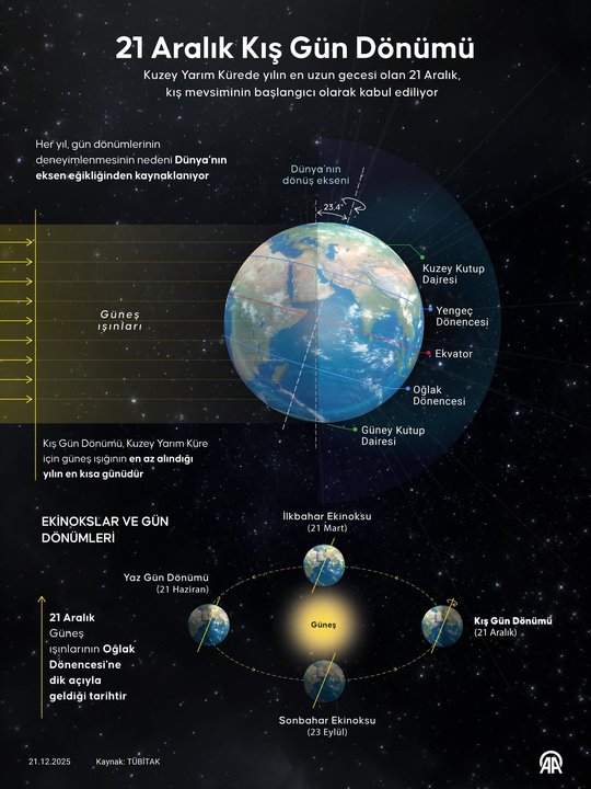 21 Aralık tarihi, Kuzey Yarım Küre’de yılın en uzun gecesi ve en kısa günü olarak astronomik takvimde önemli bir yere sahip. Bu tarih aynı zamanda kış mevsiminin astronomik başlangıcı olarak kabul ediliyor.