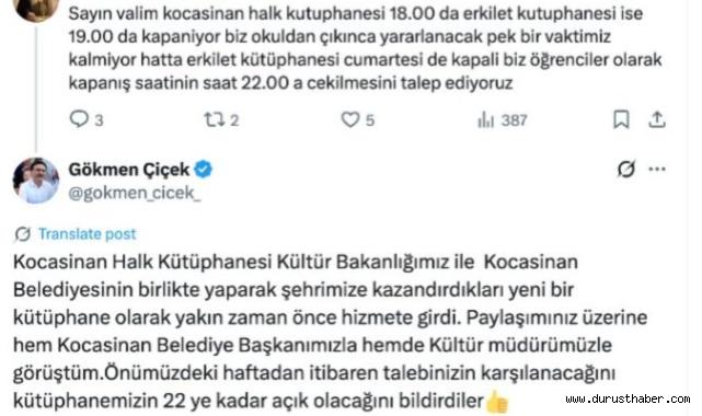 Vali Çiçek yaptığı açıklamada, “Kocasinan Halk Kütüphanesi, Kültür Bakanlığımız ile Kocasinan Belediyemizin birlikte yaparak şehrimize kazandırdıkları yeni bir kütüphane olarak yakın zamanda hizmete girdi. Paylaşımınız üzerine hem Kocasinan Belediye Başkanımızla hem de Kültür Müdürümüzle görüştüm. Önümüzdeki haftadan itibaren talebiniz karşılanacak, kütüphanemiz 22.00’ye kadar açık olacak,” dedi.