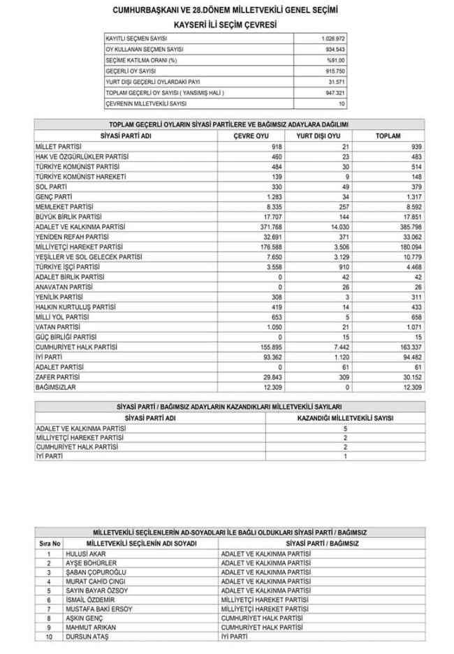 KAYSERİ (1HA) – 14 Mayıs'ta yapılan 28. Dönem Milletvekili Genel Seçimi'nin kesin sonuçlarına ilişkin karar Resmi Gazete’nin mükerrer sayısında yayınlandı.