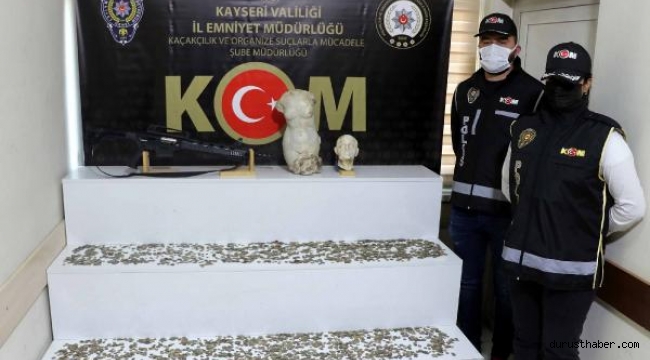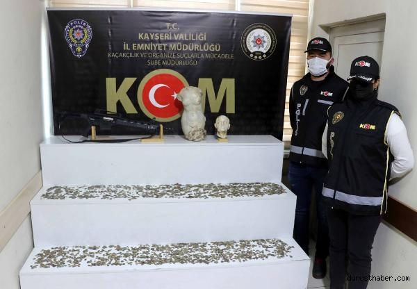 İl Emniyet Müdürlüğü Kaçakçılık ve Organize Suçlarla Mücadele Şube Müdürlüğü ekipleri, Kayseri'de Ö.D. ve Z.E.T.'nin, elinde bulundurduğu Roma ve Bizans dönemlerine ait sikke ve heykelden oluşan tarihi eserleri yurt dışına kaçıracağının bilgisini aldı. Bu kapsamda yapılan çalışmalarda şüphelilerin, tarihi eserleri Kocasinan ilçesi Talatpaşa Mahallesi'ndeki evde sakladıkları belirlendi. Eve düzenlenen operasyonda, Roma ve Bizans döneminden 5 milyon lira değerindeki 5 bin tarihi eser ele geçirildi. 2 şüpheli de polis ekipleri tarafından gözaltına alındı. Tarihi eserler, soruşturmanın tamamlanmasının ardından Müze Müdürlüğü'ne teslim edilecek.