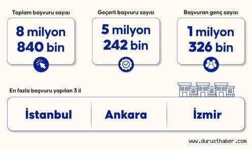 Toplam 8 milyon 840 bin başvuru alınırken, bunlardan 5 milyon 242 bini geçerli kabul edildi. Başvuranlar arasında 1 milyon 326 bin genç başvuru sahibi de bulunuyor.En fazla başvuru, sırasıyla İstanbul, Ankara ve İzmir’den geldi. Sosyal konutlar, Türkiye genelinde 81 ile yayılan projelerle hak sahiplerine teslim edilecek.Buse Yıldız
