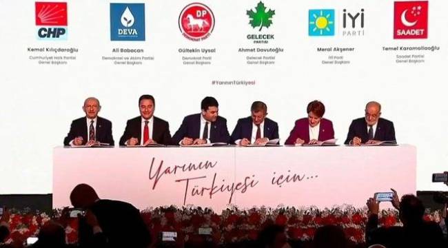 CHP, İYİ Parti, Saadet Partisi, Gelecek Partisi, Demokrat Parti ve DEVA Partisi’nin genel başkanları Ankara Bilkent Otel'de düzenlenen 'Yarının Türkiye'si için Güçlendirilmiş Parlamenter Sistem' sunumu ve imza törenine katılarak. Ortak metne imza attı. Toplantıda, yazarlar, akademisyenler, meslek ve kadın örgütleri, sendikalar ile STK temsilcileri de yer alıyor. 6 siyasi partiden toplam 300 siyasetçi de programda hazır bulundu.