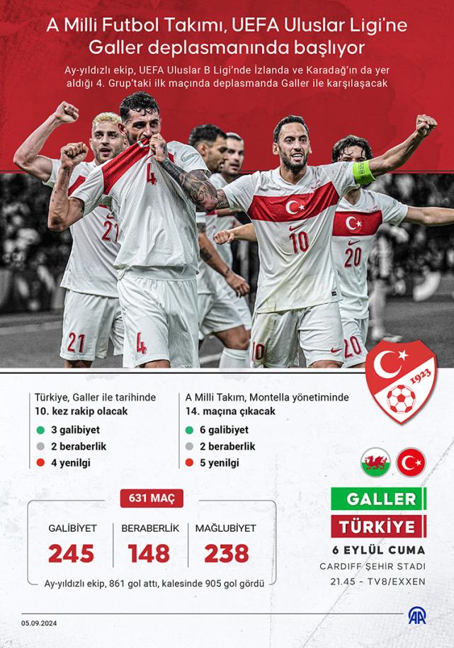 Türkiye, İtalyan teknik adam Vincenzo Montella yönetiminde 14'üncü sınavını Galler karşısında verecek.Montella'nın kulübede yer aldığı ilk 3 karşılaşmayı kazanan Türkiye, sonrasında oynadığı 5 maçta ise galibiyet elde edemedi. Ay-yıldızlı ekip EURO 2024'ün ilk maçında Gürcistan'ı yenerek galibiyet özlemine son verdi.İtalyan teknik adam yönetiminde 8'i resmi, 5'i özel 13 maça çıkan milliler 6 galibiyet elde etti, 5 mağlubiyet ve 2 beraberlik yaşadı. Rakip filelere 19 gol atan ay-yıldızlı ekip, kalesinde 20 gol gördü.Ay-yıldızlı ekip, Montella yönetimindeki ilk maçına deplasmanda Hırvatistan karşısında çıktı ve sahadan 1-0'lık galibiyetle ayrıldı. Milli takım, İtalyan teknik adam idaresinde oynadığı 2'nci maçta ise Konya'da Letonya'yı 4-0 mağlup etti. Türkiye, Vincenzo Montella idaresinde oynadığı 3'üncü karşılaşmada deplasmanda Almanya'yı 3-2 ile geçti.Montella yönetiminde 4'üncü maçını deplasmanda Galler ile oynayan ay-yıldızlı ekip, sahadan 1-1'lik beraberlikle ayrıldı. Milli takım, İtalyan teknik adam yönetimindeki ilk yenilgisini Macaristan deplasmanında 1-0'lık sonuçla aldı. Ay-yıldızlı ekip, ardından Avusturya'ya 6-1 mağlup olarak en ağır yenilgilerinden birini yaşadı. Haziran ayında oynadığı hazırlık maçlarında İtalya ile golsüz berabere kalan Türkiye, Polonya'ya ise son dakikada yediği golle 2-1 mağlup oldu.Milli takım, EURO 2024'ün ilk maçında Gürcistan'ı Mert Müldür, Arda Güler ve Kerem Aktürkoğlu'nun golleriyle 3-1 mağlup etti. Ay-yıldızlı ekip gruptaki ikinci maçında Portekiz'e 3-0 kaybetti. Gruptaki üçüncü karşılaşmasında Çekya'yı 2-1 yenen Türkiye, adını son 16 turuna yazdırdı. Milli takım, son 16 turunda da Avusturya'yı 2-1 mağlup ederek çeyrek finale kaldı. Milliler, çeyrek finalde ise Hollanda'ya 2-1 mağlup olarak turnuvaya veda etti.