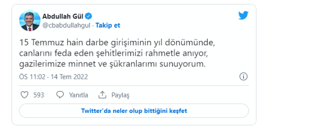11. Cumhurbaşkanı Abdullah Gül, 15 Temmuz'un yıl dönümü dolayısıyla sosyal medyadan paylaşımda bulundu. Gül, "Canlarını feda eden şehitlerimizi rahmetle anıyor, gazilerimize minnet ve şükranlarımı sunuyorum." dedi.11. Cumhurbaşkanı Abdullah Gül sosyal medya hesabı Twitter'dan 15 Temmuz darbe girişiminin yıl dönümünde paylaşımda bulundu. Gül, "15 Temmuz hain darbe girişiminin yıl dönümünde, canlarını feda eden şehitlerimizi rahmetle anıyor, gazilerimize minnet ve şükranlarımı sunuyorum." ifadelerini kullandı.