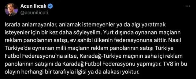 Ünlü televizyoncu Acun Ilıcalı'ya bahis soruşturması...Dün akşam Türkiye, UEFA Uluslar B Ligi 4. Grup 6.hafta maçında Karadağ ile karşılaştı.Milli mücadele, Acun Ilıcalı'nın kanalı olan TV8 ekranlarından canlı yayınlandı.YASA DIŞI BAHİS SİTELERİNİN REKLAMI PANOLARDA GÖRÜLDÜMaç sırasında reklam panolarında, yasa dışı bahis sitelerinin reklamı yapıldı.Sosyal medyada gündem olan konu hakkında Acun Ilıcalı, bir açıklamada bulundu.Ilıcalı, açıklamasında, yurt dışında oynanan maçların reklam panolarının satışlarının ev sahibi ülkeye ait olduğunu belirtti.ILICALI'DAN AÇIKLAMA GELDİIlıcalı konuyla ilgili, "Israrla anlamayanlar, anlamak istemeyenler ya da algı yaratmak isteyenler için bir kez daha söyleyelim. Yurt dışında oynanan maçların reklam panolarının satışı, ev sahibi ülkenin federasyonuna aittir. Nasıl Türkiye’de oynanan milli maçların reklam panolarının satışı Türkiye Futbol Federasyonu’na aitse, Karadağ-Türkiye maçının saha içi reklam panolarının satışını da Karadağ Futbol Federasyonu yapmıştır. TV8'in bu olayın herhangi bir tarafıyla ilgisi ya da alakası yoktur." dedi.