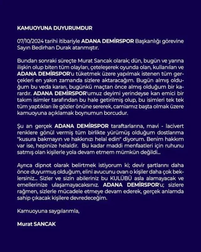 Murat Sancak yaptığı yazılı açıklamada "7 Ekim tarihi itibariyle Adana Demirspor Başkanlık görevine Bedirhan Duran atanmıştır." ifadelerini kullandı.