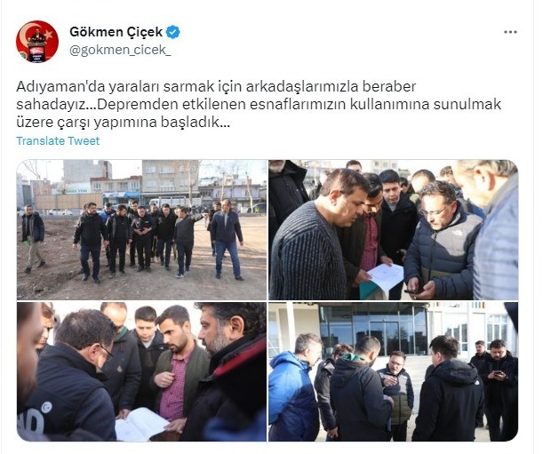Kahramanmaraş merkezli yaşanan ve ‘asrın felaketi’ olarak nitelendirilen depremin yaraları sarılıyor. Kayseri Valisi Gökmen Çiçek ise, AFAD Koordinatör Vali olarak önce Kahramanmaraş daha sonra Elbistan’a görevlendirilmişti. Görevini başarıyla icra eden Çiçek, şu anda Adıyaman’a görevlendirildi. Vali Çiçek, Adıyaman’a depremden etkilenen esnaflar için çarşı kurulacağını ifade ederek, “Adıyaman'da yaraları sarmak için arkadaşlarımızla beraber sahadayız. Depremden etkilenen esnaflarımızın kullanımına sunulmak üzere çarşı yapımına başladık” dedi.