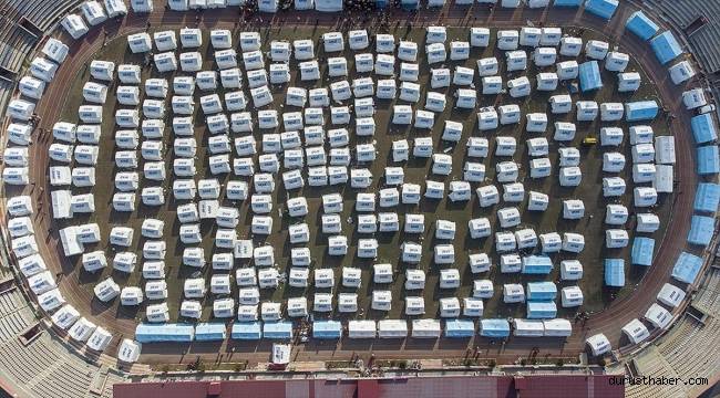 Kahramanmaraş merkezli 7,7 ve 7,6 büyüklüğündeki depremlerden etkilenenler için AFAD tarafından 12 Şubat Stadyumu'nda kurulan çadırkent havadan görüntülendi.