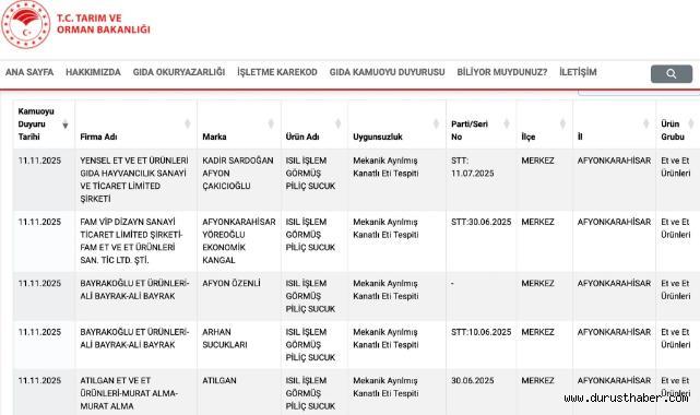 Tarım ve Orman Bakanlığı, taklit ve tağşiş yaptığı belirlenen firmaların listesini yayımladı. Açıklanan listede Afyonkarahisar’dan 5 firmanın “kırmızı et” olarak satılan sucuklara kanatlı eti karıştırdığı tespit edildi. Bakanlık, tüketicilerin ürün satın alırken etiket bilgilerini dikkatle kontrol etmelerini istedi.