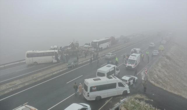 İran-Ağrı kara yolu Yoncalı köyü mevkisinde, biri Diyadin Belediyesine ait içerisinde yolcu bulunan 3 midibüs, tır, hafif ticari araç, otomobil ve trafik polis aracının karıştığı zincirleme kaza meydana geldi. İhbar üzerine kaza yerine polis, sağlık, jandarma, AFAD ve itfaiye ekipleri sevk edildi.Yaralanan 19 kişi, ambulanslarla Ağrı Eğitim ve Araştırma Hastanesine kaldırıldı.Kaza yeri dronla görüntülendi.Ulaşımı tali yoldan sağlayan ekiplerin araçları kara yolundan kaldırma çalışması devam ediyor.Öte yandan, kazanın sis nedeniyle meydana geldiği öne sürüldü. Muhabir: Abdullah Söylemez