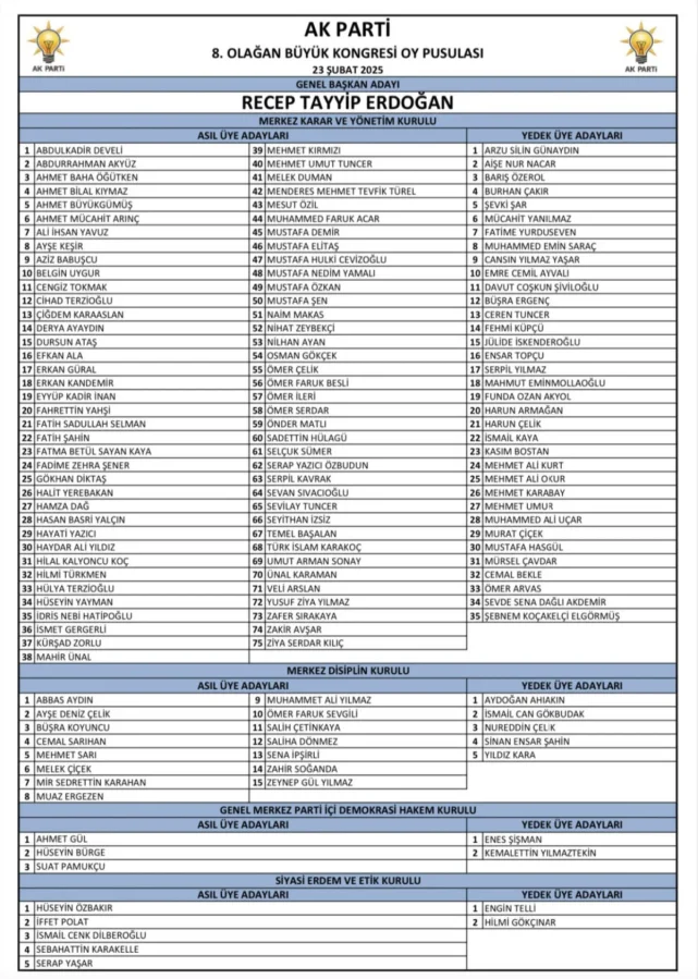 AK Parti'de 12 Ekim'de başlayan kongre maratonu bugün yapılacak 8'inci Olağan Büyük Kongre ile tamamlanıyor.Ana sloganı "Adında AK, ışığında istikbal" olarak kararlaştırılan kongrede, 1607 delegenin oy kullanacak.MKYK LİSTESİ BELLİ OLDUKongrede partinin MKYK listesinde yer alacak isimler de belli oldu.Cumhurbaşkanı Erdoğan mevcut A takımını büyük oranda yine merkez karar ve yönetim kurulu listesine almış bulunuyor.Birçok genel başkan yardımcısı MKYK üyesi olarak listede yer alacak.LİSTEDE DİKKAT ÇEKEN İSİMLERListeden spordan ekonomiye pek çok alanda dikkat çeken isimler de listeye girdi.MESUT ÖZİL DE LİSTEDEGeçtiğimiz dönemde futbolu bıraktığını açıklayan dünyaca ünlü futbolcu Mesut Özil de MKYK listesinde yer aldı.Eski Üsküdar Belediye Başkanı Hilmi Türkmen ve Eski Beyoğlu Belediye Başkanı Haydar Ali Yıldız da listede yer bulanlar arasında.Bülent Arınç’ın oğlu Mücahit Arınç yeniden listede yer alırken, Melih Gökçek’in oğlu Osman Gökçek de MKYK'da yer aldı.YENİ KATILAN VEKİLLER LİSTEDEİyi Parti’den istifa ederek AK Parti'ye katılan Ankara Milletvekili Kürşad Zorlu, İstanbul Milletvekili Seyithan İzsiz ve Konya Milletvekili Ünal Karaman yeni MKYK’da yer alan isimlerden oldu.Gelecek Partisi'nden istifa edip AK Parti'ye geçen Ankara Milletvekili Nedim Yamalı ve Antalya Milletvekili Serap Yazıcı Özbudun da listede kendilerine yer buldu.Yeniden Refah Partisi'nden istifa eden İstanbul Milletvekili Suat Pamukçu da MKYK’da yer aldı.İŞTE O İSİMLERAK Parti'yi ve teşkilatı 2028 yılında yapılacak seçimlere taşıyacak o isimler...MKYK ASİL ÜYELER- Abdülkadir Develi- Abdurrahman Akyüz- Ahmet Baha Öğütken- Ahmet Bilal Kıymaz- Ahmet Büyükgümüş- Ahmet Mücahit Arınç- Ali İhsan Yavuz- Ayşe Keşir- Aziz Babuşcu- Belgin Uygur- Cengiz Tokmak- Cihad Terzioğlu- Çiğdem Karaaslan- Derya Ayaydın- Dursun Ataş- Efkan Ala- Erkan Güral- Erkan Kandemir- Eyyüp Kadir İnan- Fahrettin Yahşi- Fatih Sadullah Selman- Fatih Şahin- Fatma Betül Sayan Kaya- Fadime Zehra Şener- Gökhan Diktaş- Halit Yerbakan- Hamza Dağ- Hasan Basri Yalçın- Hayati Yazıcı- Haydar Ali Yıldız- Hilal Kalaycıoğlu Koç- Hilmi Türkmen- Hülya Terzioğlu- Hüseyin Yayman- İdris Nebi Hatipoğlu- İsmet Gergerli- Kürşad Zorlu- Mahir Ünal- Mehmet Kırmızı- Mehmet Umut Tuncer- Melek Duman- Menderes Mehmet Tevfik Türel- Mesut Özil- Muhammed Faruk Acar- Mustafa Demir- Mustafa Elitaş- Mustafa Hulki Cevizoğlu- Mustafa Nedim Yamalı- Mustafa Özkan- Mustafa Şen- Naim Makas- Nihat Zeybekçi- Nilhan Ayan- Osman Gökçek- Ömer Çelik- Ömer Faruk Besli- Ömer İleri- Ömer Serdar- Önder Matlı- Sadettin Hülagü- Selçuk Sümer- Serap Yazıcı Özbüdün- Serpil Kavrak- Sevan Sivacıoğlu- Sevilay Tuncer- Seyithan İzsiz- Temel Basalan- Türk İslam Karakoç- Umut Arman Sonay- Ünal Karaman- Veli Arslan- Yusuf Ziya Yılmaz- Zafer Sırakaya- Zakir Avşar- Ziya Serdar KılıçMKYK YEDEK ÜYELER- Arzu Silin Günaydın- Ayşe Nur Nacar- Barış Özerol- Burhan Çakır- Şevki Sar- Mücahit Yanılmaz- Fatime Yurduseven- Muhammed Emin Saraç- Cansın Yılmaz Yaşar- Emre Cemil Ayvalı- Davut Coşkun Şiviloğlu- Büşra Ergenç- Ceren Tuncer- Fehmi Küpçü- Jülide İskenderoğlu- Ensar Topçu- Serpil Yılmaz- Mahmut Eminmollaoğlu- Funda Ozan Akyol- Harun Armağan- Harun Çelik- İsmail Kaya- Kasım Bostan- Mehmet Ali Kurt- Mehmet Ali Okur- Mehmet Karabay- Mehmet Umur- Muhammed Ali Uçar- Murat Çiçek- Mustafa Hasgül- Mürsel Çavdar- Cemal Bekle- Ömer Arvas- Sevde Sena Dağlı Akdemir- Şebnem Koçakelçi ElgörmüşMERKEZ DİSİPLİN KURULU ASİL ÜYELER- Abbas Aydın- Ayşe Deniz Çelik- Büşra Koyuncu- Cemal Sarıhan- Mehmet Sarı- Melek Çiçek- Mir Sedrettin Karahan- Muaz Ergezen- Muhammet Ali Yılmaz- Ömer Faruk Sevgili- Salih Çetinkaya- Saliha Dönmez- Sena İpşirli- Zahir Soğanda- Zeynep Gül YılmazMERKEZ DİSİPLİN KURULU YEDEK ÜYELER- Aydoğan Ahıakın- İsmail Can Gökbudak- Nureddin Çelik- Sinan Ensar Şahin- Yıldız KaraGENEL MERKEZ PARTİ İÇİ DEMOKRASİ HAKEM KURULU ASİL ÜYELER- Ahmet Gül- Hüseyin Bürge- Suat PamukçuGENEL MERKEZ PARTİ İÇİ DEMOKRASİ HAKEM KURULU YEDEK ÜYELER- Enes Şişman- Kemalettin YılmaztekinSİYASİ ERDEM VE ETİK KURULU ASİL ÜYELER- Hüseyin Özbakır- İffet Polat- İsmail Cenk Dilberoğlu- Sebahattin Karakelle- Serap YaşarSİYASİ ERDEM VE ETİK KURULU YEDEK ÜYELER- Engin Telli- Hilmi Gökçınar
