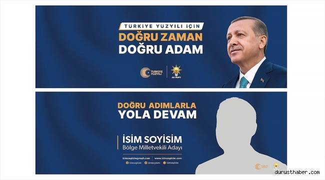 Kampanya sürecinde adaylarca kullanılacak afiş, billboard, broşür, araç giydirme, kartvizit, pankart, sosyal medya ve sahne tasarımları belirlendi.AK Parti, 14 Mayıs seçimlerinde, "Türkiye Yüzyılı için doğru zaman doğru adam" ve "Doğru adımlarla yola devam" sloganlarını kullanacak. Aday broşürlerinin ön yüzünde Cumhurbaşkanı Erdoğan'ın, "Kalbimizden inancı, yüreğimizden cesareti, bileğimizden gücü, sırtımızdan teri hiç eksik etmeden durmaksızın çalışacağız. Bu memleket için doğru işler yapacağız, doğru olacağız." sözü ile fotoğrafı yer alacak. Diğer bölümlerde ise şehir ismi ve adayın fotoğrafıyla ismi bulunacak. Broşürde ayrıca Türkiye Yüzyılı'nı anlatan metne de yer verilecek.