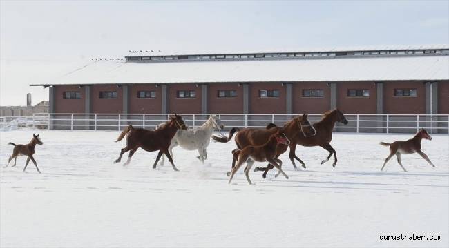 Hava sıcaklığının zaman zaman sıfırın altında 15 dereceyi bulduğu bölgede yer alan işletme sahası, iki gündür yağan karla beyaz örtüyle kaplandı.İşletmede yetiştirilen hayvanlara, kış mevsiminin zor şartlarında titizlikle bakılıyor. Dondurucu soğuk havada hayvanların tüm ihtiyaçları belirlenen çalışma programı çerçevesinde aksatılmadan görülüyor. Birçok rekor satışa imza atılan işletmede yetiştirilen tayların beslenme ve bakımları özenle yapılıyor.İşletmede büyük emekle yetiştirilen hayvanlardan bazıları ilk kez karla buluştu. Tay, kuzu ve buzağıların kar örtüsüyle ilk defa buluşması, anneleriyle koşuşturması AA ekibince dronla görüntülendi.İşletmede geçen yıl 1546 kuzu dünyaya gözlerini açtı