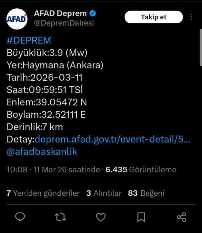 Ankara Haymana’da sabah saatlerinde deprem meydana geldi. Afet ve Acil Durum Yönetimi Başkanlığı (AFAD) tarafından bilgiler paylaşıldı.