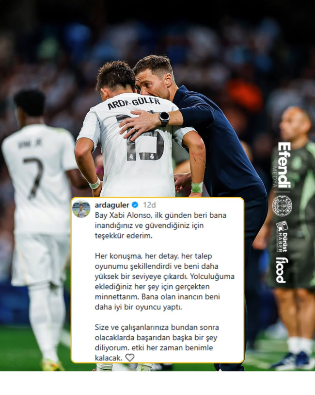 Real Madrid’in genç yıldızı Arda Güler, takımın eski teknik direktörü Xabi Alonso’ya duygusal bir Veda mesajı yayımladı. Arda paylaşımında, “İlk günden itibaren bana inandığınız ve güvendiğiniz için teşekkür ederim. Her konuşmanız, her detay, her isteğiniz oyunumu geliştirmemde ve seviyemi yükseltmemde büyük rol oynadı. Yolculuğuma kattığınız her şey için minnettarım. Bana duyduğunuz inanç, beni daha iyi bir futbolcu yaptı” ifadelerini kullandı.
