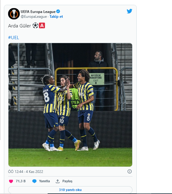Avrupa Ligi'nde Dinamo Kiev karşılaşmasında ilk gol sevincini yaşayan Fenerbahçe'nin genç yıldızı Arda Güler, Arao'nun golünde de asist yapan isim oldu. Arda, bu performansıyla hem Fenerbahçe hem de UEFA tarihine geçti.UEFA Avrupa Ligi’ndeki kritik Dinamo Kiev müsabakasına ilk 11’de başlayan 17 yaşındaki Arda Güler, ilk yarıda 1 gol atıp 1 de asist yaparak sarı-lacivertli takımı 2-0’lık galibiyete taşıdı.17 yaşındaki Arda Güler, 19 yaşındaki Jude Bellingham’ı geride bırakarak bu sezon Avrupa kupalarının grup aşamasında bir maçta hem gol atan hem de asist yapan en genç oyuncu oldu.UEFA'nın resmi Twitter hesabından, "Yıldız çocuk" yazarak Arda Güler’i öven bir paylaşım yapıldı.