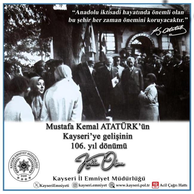 Gazi Mustafa Kemal Atatürk’ün Kayseri’ye gelişinin 106’ncı yıl dönümü dolayısıyla Kayseri İl Emniyet Müdürlüğü anlamlı bir mesaj yayımladı. Mesajda, Atatürk’ün Kayseri ziyaretiyle Millî Mücadele sürecinde şehrin üstlendiği tarihi role vurgu yapıldı.