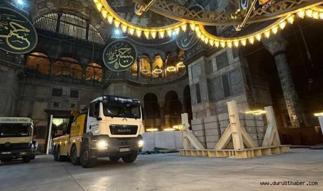 Çalışmalarda kullanılması planlanan en büyük araç 45 ton ağırlığındadır. Bu aracın metrekareye düşen ağırlığı ise 6 tondur. Hazırlanan özel zemin, en ağır aracın ağırlığını güvenle taşıyacak kapasitededir.Yaklaşık bir yıl süren hazırlık çalışmalarının ardından da projeler oluşturularak ve Bilim Heyeti ve Koruma Kurulu kararları alınarak uygulamalara başlanmıştır.Caminin batı avlusu girişinden cami harim bölümü girişine kadar tüm zeminde statik hesaplarına uygun olarak bahçe ve iç-dış narteks bölümlerinde prekastlar ve ahşap elemanlar ile desteklenen çelik platform yapılmıştır. Bu sayede hem mermer zeminlerin korunması sağlanmış hem de alan araç girişi için uygun hale getirilmiştir.Caminin harim bölümünde öncelikli olarak mevcut mermer zeminin belgelemeleri yapılmış, mermer döşemlerin yatak harcının kontrolü sağlanmıştır. Ardından iç mekanda georadar tarama ve zemin sınıfı testi yapılmıştır. Yapılan ön çalışmaların ardından iş makinelerinin hareket edeceği tüm alanda hem yükün yayılmasını hem de mermer döşemelerin korunmasını sağlayacak çok katmanlı geçici döşeme sistemi yapılmıştır. Ayasofya’nın özgün mermer zemininin zarar görmemesi için sırasıyla