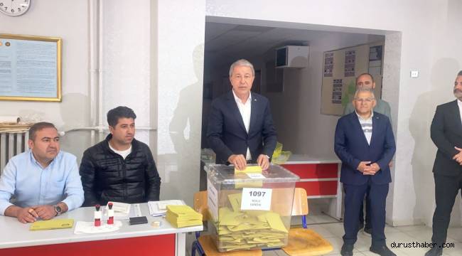 Oy kullandıktan sonra gazetecilere açıklama yapan Hulusi Akar, “Öncelikle Anneler Günü’nü en içten dileklerimle kutluyorum. Seçimin halkımıza, vatanımıza ve milletimize hayırlı olmasını diliyorum. Refahımız ve geleceğin istikrarı bakımından seçimi önemsiyoruz. Umarım bu seçim süreci demokratik çerçevede tamamlanır. Bütün partiler olarak düşüncelerimizi ve yapmak istediklerimizi söyledik. Bugün vatandaş kararını verecek. Bunun da vatanımıza, milletimize hayırlı ve uğurlu olmasını diliyorum” açıklamasında bulundu.
