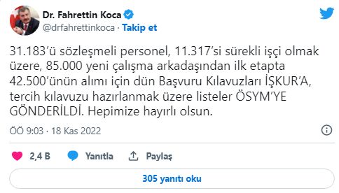 Sağlık Bakanı Fahrettin Koca, 85 bin sağlık personeli alımına ilişkin 'son dakika' gelişmesini duyurdu.Bakan Koca, "31.183’ü sözleşmeli personel, 11.317’si sürekli işçi olmak üzere, 85.000 yeni çalışma arkadaşından ilk etapta 42.500’ünün alımı için dün Başvuru Kılavuzları İŞKUR’A, tercih kılavuzu hazırlanmak üzere listeler ÖSYM’YE GÖNDERİLDİ. Hepimize hayırlı olsun" açıklamasını yaptı.