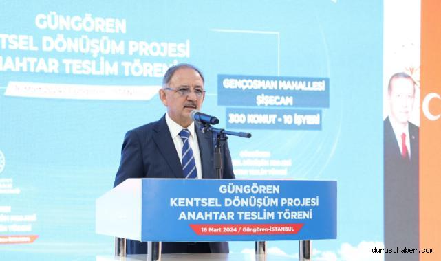 Çevre, Şehircilik ve İklim Değişikliği Bakanı Mehmet Özhaseki, İstanbul’un kentsel dönüşümü için net konuştu.İstanbul’da kentsel dönüşümü hızla devam ettireceklerini belirten Bakan Özhaseki, “Böyle kadim şehirlerde yapılacak tek şey kentsel dönüşüm. Bunun dışında çözüm yok.” dedi.Kentsel dönüşüm konusunda muhalefet partilerinin belediye başkanlarını eleştiren Bakan Özhaseki, “Kentsel dönüşümü yapmaya uğraşan belediye başkanlarımız sadece Cumhur İttifakı belediye başkanları.” ifadelerini kullandı.Çevre, Şehircilik ve İklim Değişikliği Bakanı Mehmet Özhaseki, İstanbul Güngören’de “Tozkoparan 2'nci Etap ve Şişecam Evleri Anahtar Teslim Töreni”nde konuştu.Bakan Özhaseki, ülkenin depreme hazırlanması konusunda kentsel dönüşümün şart olduğunu söyledi. Kentsel dönüşüm konusunda muhalefet partilerin belediye başkanlarını eleştiren Bakan Özhaseki, “Kentsel dönüşüm için sadece Cumhur İttifakındaki arkadaşlarımız gayret ediyor. Kentsel dönüşüm yapanlar sadece bizimkiler. Kentsel dönüşümü yapmaya uğraşan belediye başkanlarımız sadece Cumhur İttifakı belediye başkanları. Onun dışındakiler ne yapıyorlar? Ana muhalefetin bir modası var. Şöyle yapıyor, ‘Biz kentsel dönüşüme karşı değiliz, rantsal dönüşüme karşıyız.’ Rantsal dönüşüme biz de karşıyız. Ranstal dönüşüm ne demek ya? CHP'li arkadaşlara söylüyorum, bunu söyleyerek kaçamazsınız.” diye konuştu. “İSTANBUL’DA YAPILACAK BİRİNCİ İŞ KENTSEL DÖNÜŞÜM”