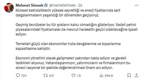 Küresel çapta tedirginlik yaratan bu gelişmelerin ardından Hazine ve Maliye Bakanı Mehmet Şimşek, sosyal medya hesabı üzerinden konuya ilişkin kapsamlı bir değerlendirme yayımladı. Piyasaları sakinleştirmeyi hedefleyen Bakan Şimşek, küresel belirsizliklerin yüksek seyrettiği ve enerji fiyatlarında oldukça sert dalgalanmaların yaşandığı hassas bir dönemden geçildiğini belirterek durum tespitinde bulundu. Şimşek, devletin ilgili kurumlarının teyakkuzda olduğunu vurgulayarak, "Ekonomi yönetimi olarak gelişmeleri yakından takip ediyor ve gerekli tedbirleri alıyoruz" ifadeleriyle kamuoyuna güvence verdi.