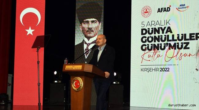 Soylu, Kırşehir'de AFAD tarafından Neşet Ertaş Kültür Merkezi'nde 5 Aralık Dünya Gönüllüler Günü dolayısıyla düzenlenen programda yaptığı konuşmada, memleketin her köşesinin medeniyet, tarih ve kültür zengini olduğunu belirtti.Ahi Evran'ın şehri Kırşehir'de bulunmaktan mutlu olduğunu anlatan Soylu, "Aynı zamanda Hacı Bektaş'ın toprağındayız, yine Aşık Paşa'nın şehrindeyiz, üstat Neşet Ertaş'ın, onun babası Muharrem Ertaş'ın şehrindeyiz." dedi.Soylu, 12 Kasım'da tüm ülkede Düzce depreminin yıl dönümünde afet tatbikatı yapıldığını anımsatarak, şunları aktardı:"Hem onu anmak hem orada kaybettiklerimizi tekrar rahmetle yad etmek, aynı zamanda geleceğimize ait yapabileceklerimizin, gelecek nesillerimize bırakabileceklerimizin afet anlamında bir kez daha bütün milletimizle, toplumumuzla, ülkemizle paylaşabilmek için bir tatbikat gerçekleştirdik. Ardından Düzce'de bir deprem oldu. Biz afet bölgesiyiz, depremleri, selleri yaşıyoruz, Cumhuriyet tarihinin en büyük yangınlarıyla yüzleştik. Çığ, kaya düşmesi ve birçok afet çeşidiyle karşı karşıya kalan bir ülkeyiz. Elbette ki burada toplumumuzu, milletimizi buna hazırlamak bizim en temel görevimiz."Düzce depreminde devletin bütün kurum ve kuruluşlarıyla sabahın erken saatlerinde bölgede olduğunu dile getiren Soylu, "Sabahın erken saatinde bu ülkenin Cumhurbaşkanı Düzce depremi için ayaktaydı, bakanlar oradaydı. Bütün herkes vatandaşının karşı karşıya kalmış olduğu endişe ve korkunun ortadan kalkabilmesi için çaba sarf ediyordu." diye konuştu."Devlet bütün unsurlarıyla beraber vatandaşları yalnız bırakmadı"