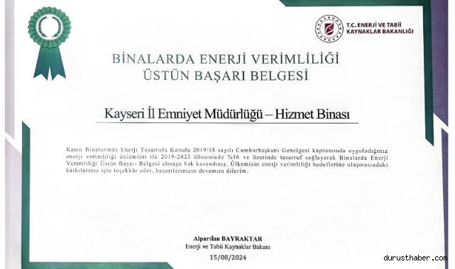 Kayseri İl Emniyet Müdürlüğü 2019-2023 yılları arasında kamu kaynaklarının maliyetini azaltarak Enerji ve Tabi Kaynaklar Bakanlığı tarafından Üstün Başarı Belgesi ödülüne layık görüldü.