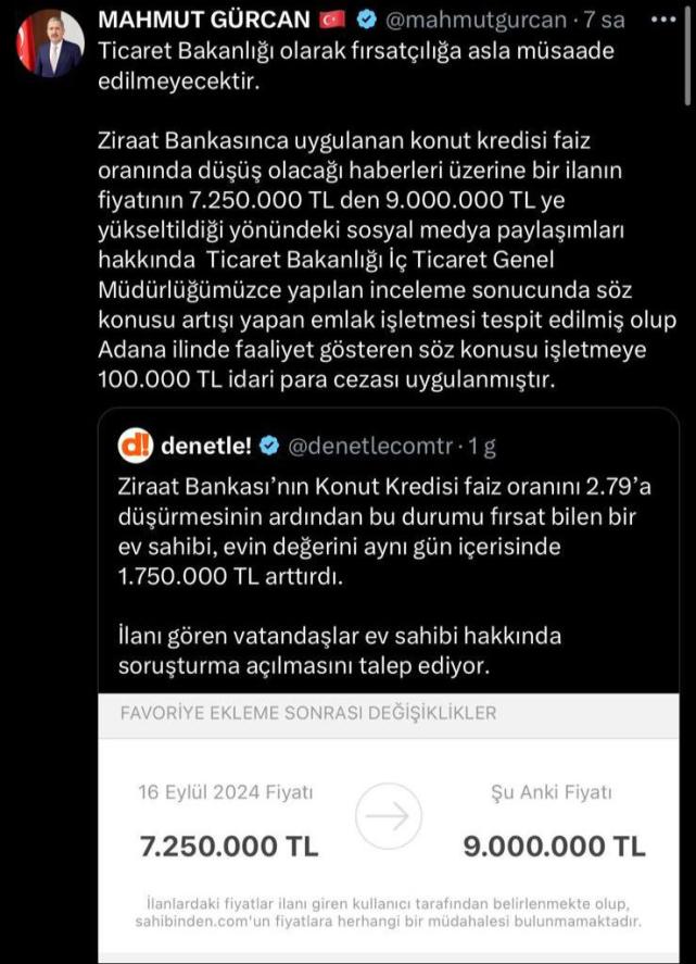 Bakanlık, Adana ilinde faaliyet yürüttüğü tespit edilen söz konusu işletmeye 100 bin lira idari para cezası uyguladı. Ticaret Bakan Yardımcısı Mahmut Gürcan konuya ilişkin sosyal medya hesabından yaptığı açıklamada "Ticaret Bakanlığı olarak fırsatçılığa asla müsaade edilmeyecektir. Ziraat Bankasınca uygulanan konut kredisi faiz oranında düşüş olacağı haberleri üzerine bir ilanın fiyatının 7.250.000 TL den 9.000.000 TL ye yükseltildiği yönündeki sosyal medya paylaşımları hakkında Ticaret Bakanlığı İç Ticaret Genel Müdürlüğümüzce yapılan inceleme sonucunda söz konusu artışı yapan emlak işletmesi tespit edilmiş olup Adana ilinde faaliyet gösteren söz konusu işletmeye 100.000 TL idari para cezası uygulanmıştır" ifadelerine yer verdi.