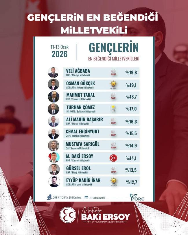 Araştırma sonuçları, MHP Kayseri Milletvekili Baki Ersoy tarafından sosyal medya hesabı üzerinden paylaşıldı. Paylaşımda, gençlerin en beğendiği milletvekillerine ilişkin liste ve oranlar yer aldı.
