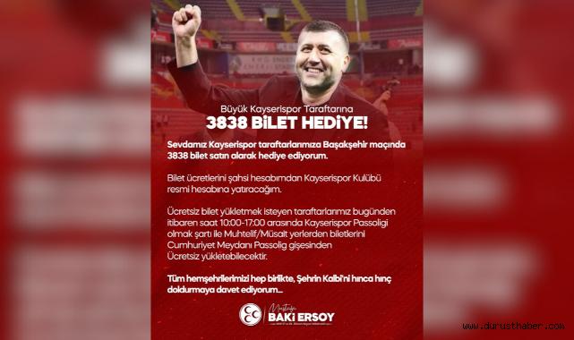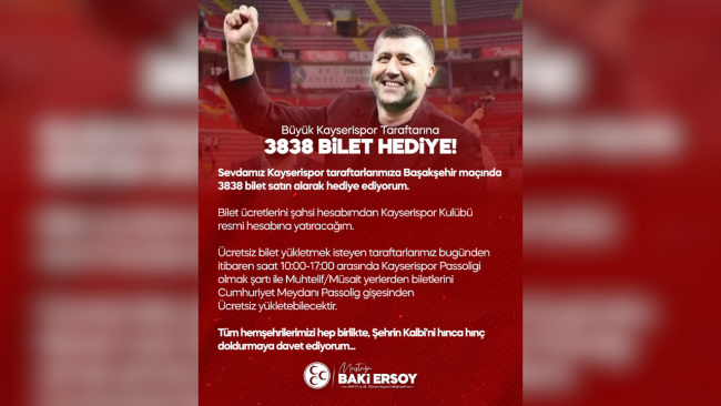 Kayserispor’a destek amacıyla dikkat çeken bir kampanya başlatıldı. MHP Kayseri Milletvekili Mustafa Baki Ersoy, Başakşehir ile oynanacak karşılaşma için 3 bin 838 bilet satın alarak taraftarlara ücretsiz olarak dağıtacağını açıkladı.