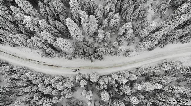 eklenen kar yağışının bölgede etkili olmasıyla çam ve meşe ağaçlarıyla kaplı 1570 metre rakımlı Ballıdağ, beyaza büründü.