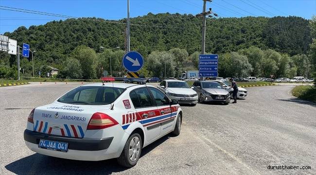 Bartın Limanı yol ayrımında yolu dubalarla kapatan jandarma ekipleri, beldede park alanı kalmadığı yönünde uyardıkları sürücülerden geri dönmelerini istedi.