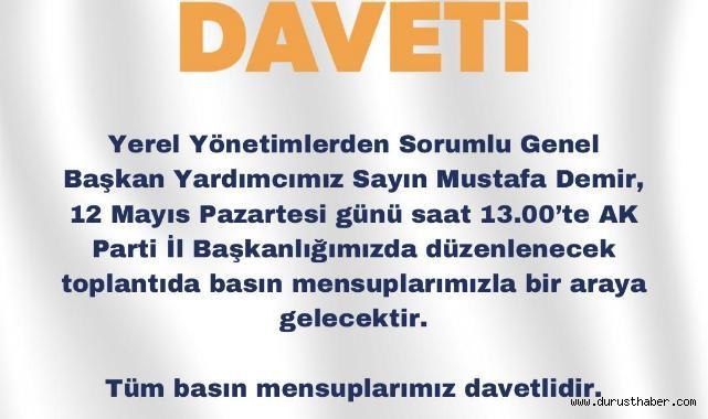 AK Parti Yerel Yönetimlerden Sorumlu Genel Başkan Yardımcısı Sayın Mustafa Demir, 12 Mayıs Pazartesi günü saat 13.00’te Kayseri’de Basın mensuplarıyla bir araya gelecek.