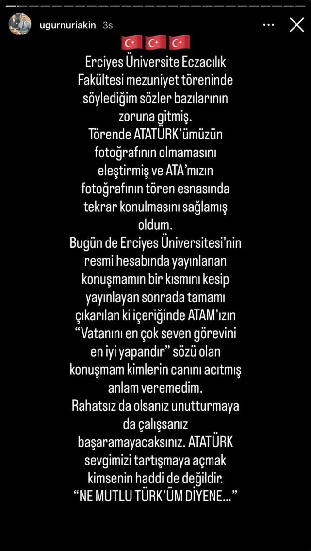 Kayseri Eczacı Odası Başkanı Uğur Nuri Akın, Erciyes Üniversitesi Eczacılık Fakültesi mezuniyet töreninde Atatürk’ün fotoğrafının yer almamasına gösterdiği tepkinin ardından sosyal medyada konuşmasının kesilmiş bir şekilde paylaşılmasını eleştirerek, “Törende söylediğim sözler bazılarının zoruna gitmiş. Bugün de Erciyes Üniversitesi’nin resmi hesabında yayınlanan konuşmamın bir kısmını kesip yayınlayan, sonradan tamamı çıkarılan ki içeriğinde Ata’mızın “Vatanını en çok seven görevini en iyi yapandır” sözü olan konuşmam kimlerin canını acıtmış anlam veremedim” dedi.