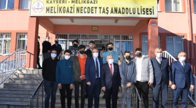 Necdet Taş Anadolu Lisesi ziyaretine Başkan Büyükkılıç’ın yanı sıra Kayseri İl Milli Eğitim Müdürü Ayhan Teltik, Melikgazi İlçe Milli Eğitim Müdürü Hacı Kaya, Okul Müdürü Saim Sönmez ile öğretmenler ve öğrenciler katıldı.