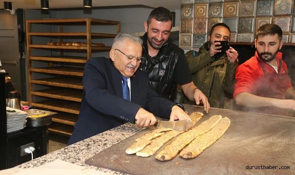 Her fırsatta Kayserililerle buluşmaya özen gösteren Büyükşehir Belediye Başkanı Dr. Memduh Büyükkılıç, bu kez kent merkezindeki önemli ticaret merkezlerinden Hunat Mahallesi’nde esnaflarla bir araya geldi.Büyükkılıç’ın ziyaret ettiği esnaf dükkânında sıcak ve samimi bir ortamda sohbet gerçekleşirken, Kayserililer Büyükkılıç’a ilgi ve alakasından dolayı teşekkür etti.Esnaf ziyareti yaptığı sırada Hunat Camii yanındaki pide fırınına giren Başkan Büyükkılıç, pide pişirdi. Büyükkılıç, fırın küreğini eline alarak, pişen pideleri fırından çıkarttı. Bir süre fırın çalışanları ile sohbet eden Başkan Büyükkılıç, pişirilen pideden de vatandaşlara ikram etmeyi ihmal etmedi.Büyükkılıç, paylaşmanın bereketine vurgu yaparak, “Bu kadim toprakların bereketidir ekmeği paylaşmak. Bir olmak, birlik olmaktır; ekmeği bölüşmek. Biz de esnaf ziyaretimizde Hunat Camii yanındaki pide fırınında esnaf kardeşimiz Nihat ile birlikte hem yaptık, hem paylaştık hem de hep birlikte yedik” diye konuştu.