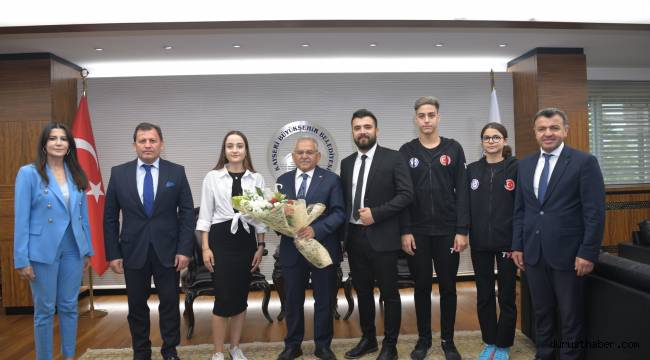 Kayseri Büyükşehir Belediye Başkanı Dr. Memduh Büyükkılıç, Gençlik Haftası kapsamında Gençlik ve Spor İl Müdürü Ali İhsan Kabakcı ve genç milli sporcuları makamında ağırladı.Gençlik ve Spor İl Müdürü Ali İhsan Kabakcı ve genç milli sporcular, 19 Mayıs Atatürk’ü Anma, Gençlik ve Spor Bayramı dolayısıyla Gençlik Haftası kapsamında, genç dostu anlayış ile çalışmalarını sürdüren Kayseri Büyükşehir Belediye Başkanı Dr. Memduh Büyükkılıç’a ziyaret gerçekleştirdi.Başkanlık makamında gerçekleşen ziyarette, gençler tarafından Başkan Büyükkılıç’a çiçek takdimi yapıldı.Burada açıklamalarda bulunan Kayseri Büyükşehir Belediye Başkanı Dr. Memduh Büyükkılıç, “Gençlerimize, değerli müdürümüze ve hocalarımıza hoş geldiniz diyorum. Onların şahsında tüm gençlerimizin Atatürk’ü Anma, Gençlik ve Spor Bayramı’mızı tebrik ediyorum. Sağlıklı, huzurlu daha nice yıllara diye temennide bulunuyorum” dedi.