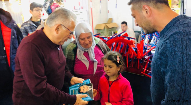 Başkan Büyükkılıç, konu ile ilgili yaptığı açıklamada, “Yöresel Ürünler Fuarı'nı ziyaret ederek, esnaflarımıza hayırlı işler temennisinde bulunduk. Aileleriyle birlikte alışveriş yapmaya gelen yavrularımıza da kitap dağıttık” dedi.