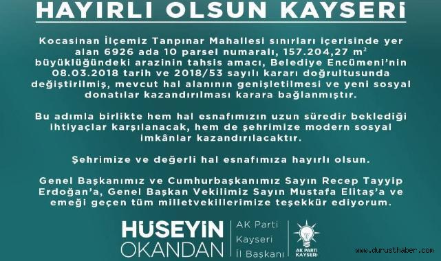 Başkan okandan ayrıca, sürece verdikleri destek için Cumhurbaşkanı Recep Tayyip Erdoğan, AK Parti Genel Başkan Vekili Mustafa Elitaş ve emeği geçen tüm milletvekillerine teşekkür etti.