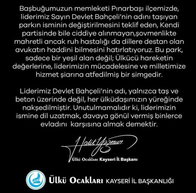 Ülkü Ocakları Kayseri İl Başkanı Halit Yağmur, sosyal medya hesabından yaptığı açıklamada "Başbuğumuzun memleketi Pınarbaşı ilçemizde, liderimiz Sayın Devlet Bahçeli’nin adını taşıyan parkın isminin değiştirilmesini teklif eden, kendi partisinde bile ciddiye alınmayan, şovmenlikte maharetli ancak ruh hastalığı da dillere destan olan avukatın haddini bilmesini hatırlatıyoruz. Bu park, sadece bir yeşil alan değil; Ülkücü hareketin değerlerine, liderimizin mücadelesine ve milletimize hizmet şiarına atfedilmiş bir simgedir.
