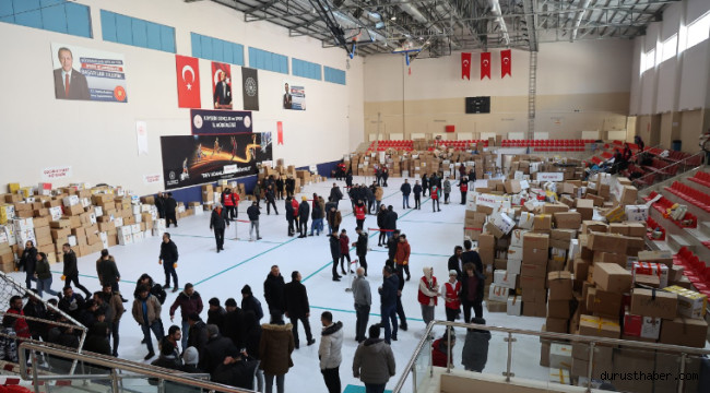 Çadırdan battaniyeye, ayakkabıdan kışlık kıyafete kadar binlerce malzeme, belediye personeli ve Kızılay gönüllüleri tarafından Talas Spor Salonuna indirilerek deprem bölgesine gönderilmek üzere tasnif edildi.