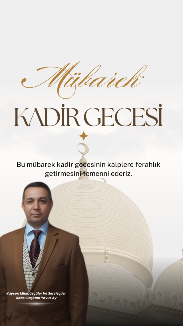 Kayseri Minibüsçüler ve Servis İşletmecileri Odası Yönetim Kurulu Başkanı Yavuz Ay, Kadir Gecesi dolayısıyla bir mesaj yayımladı. Başkan Ay, İslam âlemi için büyük anlam ve önem taşıyan bu müstesna gecenin, birlik ve beraberliği pekiştirmesini temenni etti.