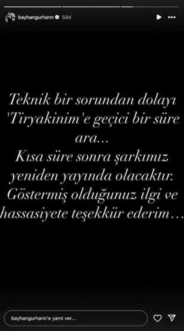 "Teknik bir sorundan dolayı Tiryakinim'e geçici bir süre ara... Kısa süre sonra şarkımız yeniden yayında olacaktır.