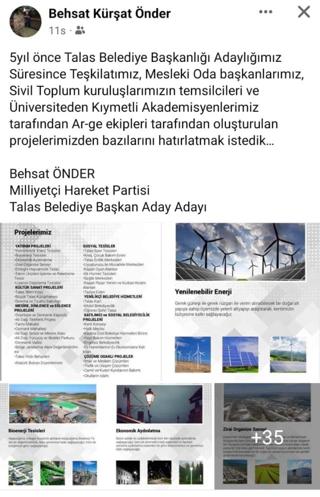 Önder, STK'LAR ile uyumlu olarak çalıştıklarını ifade ederek, "5 yıl önce Talas Belediye Başkanlığı Adaylığımız Süresince Teşkilatımız, Mesleki Oda başkanlarımız, Sivil Toplum kuruluşlarımızın temsilcileri ve Üniversiteden Kıymetli Akademisyenlerimiz tarafından Ar-ge ekipleri tarafından oluşturulan projelerimizden bazılarını hatırlatmak istedik" ifadelerini kullandı.