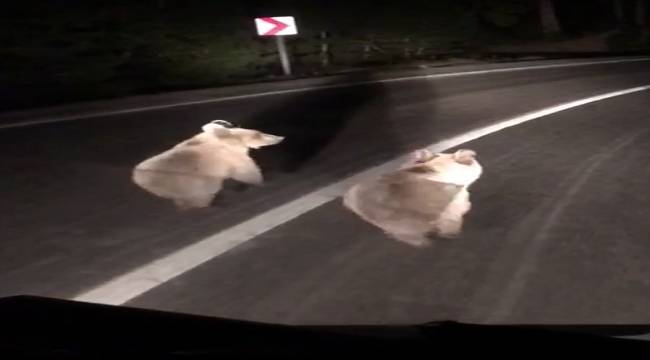 Beypazarı-Kıbrıscık yolunda seyir halindeki bir sürücü, gece saatlerinde yolda iki ayı yavrusunun koştuğunu fark etti.Sürücü, ayıların aracın önünde koştuğu anları cep telefonuna kaydetti.
