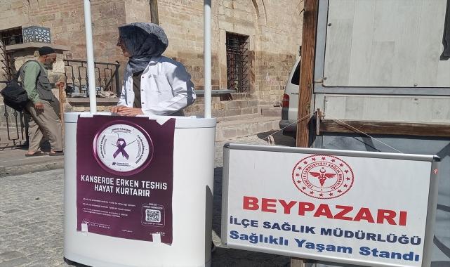 Beypazarı İlçe Sağlık Müdürlüğü, "Kanserde Erken Teşhis Hayat Kurtarır" sloganıyla cami önlerinde stant açıp bilgilendirme çalışması yaptı. İlçe merkezindeki cami önlerinde kurulan stantlarda, vatandaşlara ücretsiz kanser taraması hakkında bilgi verilerek broşür dağıtıldı.İlçe Sağlık Müdürü Dr. Kerem Zeki Fikret, hastalıklar konusunda toplumu bilgilendirmeyi sürdürdüklerini söyledi.Kanserde erken teşhisin önemini anlatmak için de çalışma yaptıklarını belirten Fikret, "Bugün de çarşı merkezinde camilerin önlerinde stantlar açtık. Ücretsiz kanser taraması için aile hekimlerimiz vatandaşları bekliyor." dedi.